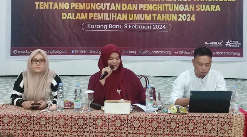 Ketua KIP Aceh Tamiang, Rita Afrianti saat pembukaan acara Bimtek tersebut mengingatkan agar PPK wajib membaca dan mempedomani Peraturan Komisi Pemilihan Umum (PKPU) Nomor 25 tahun 2023, sebagai pedoman teknis dan aturan proses pungut dan hitung pada Pemilu 2024.